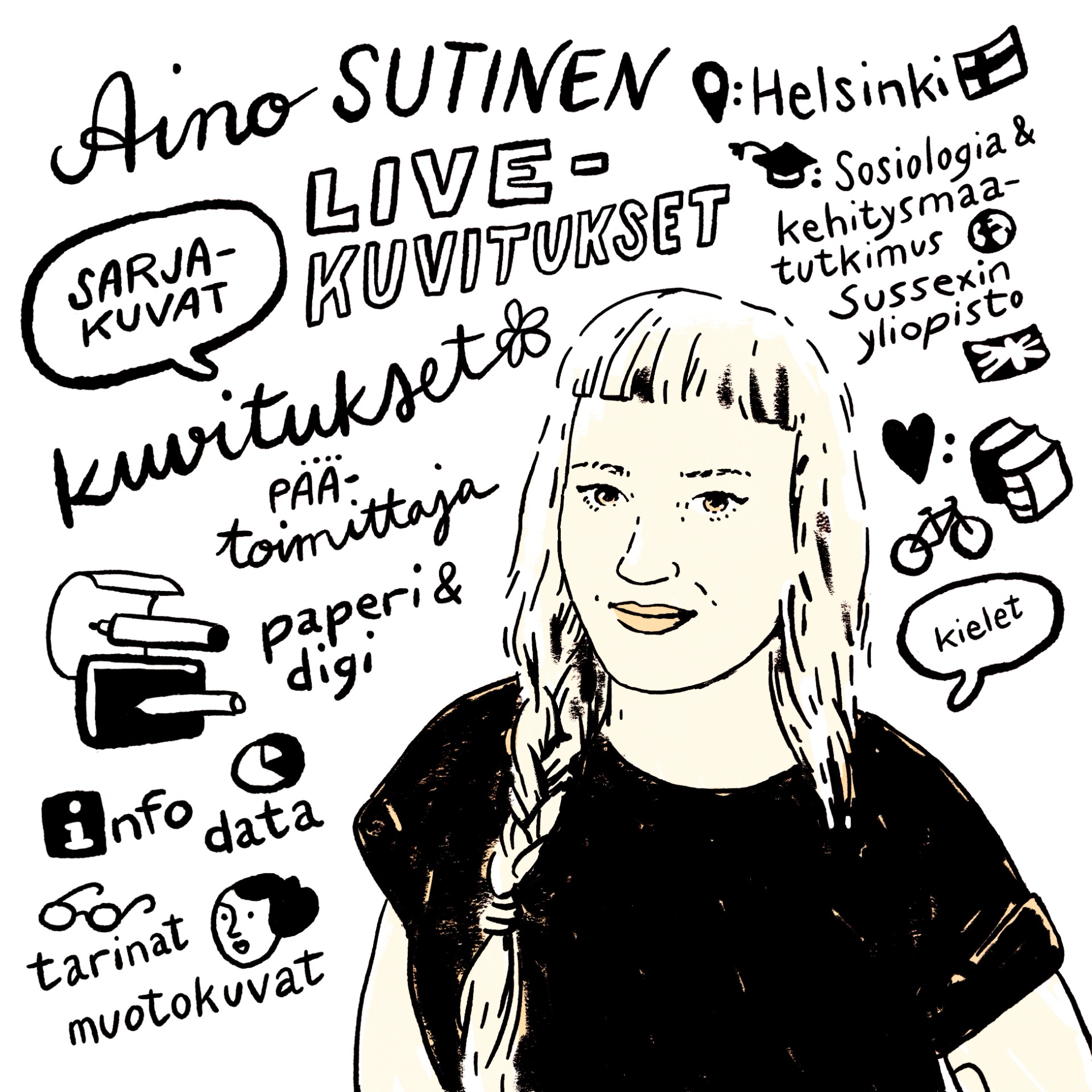 Olen helsinkiläinen freelance-kuvittaja. Teen infosarjakuvia, livekuvituksia, kuvituksia, muotokuvia ynnä muita sarjakuvaan ja piirtämiseen liittyviä töitä. Usein olen tehnyt muun muassa tiedeviestintää.