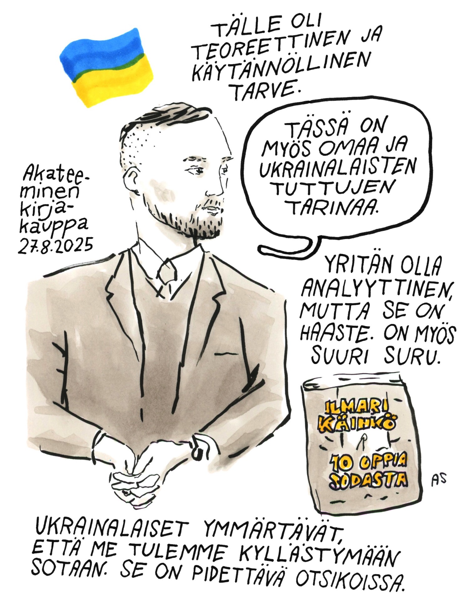 Tapahtumakuvitus sotatieteilijä Ilmari Käihkön kirjan puhetilaisuudesta (pro bono, 2025, kuvat blogissa).
