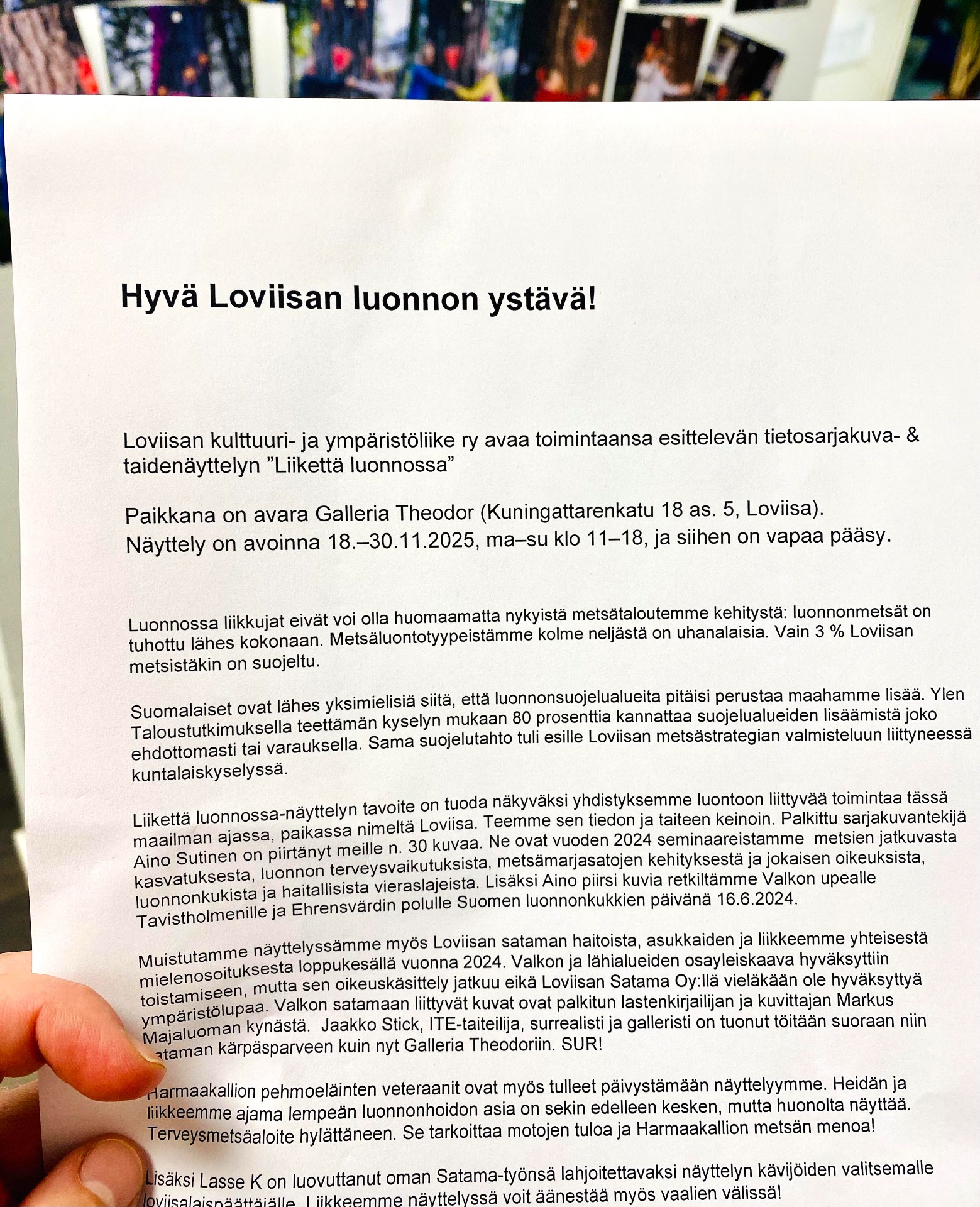 Näyttely Loviisan Galleria Theodorissa 17.–30.11., avajaiset ti 18.11. Siellä on pääosin piirroksiani ja myös muutamia töitä paikallisilta taiteilijoilta, myös paikallisista ympäristö- ja kaava-aiheista, esim. Markus Majaluoman pilapiirroksia.