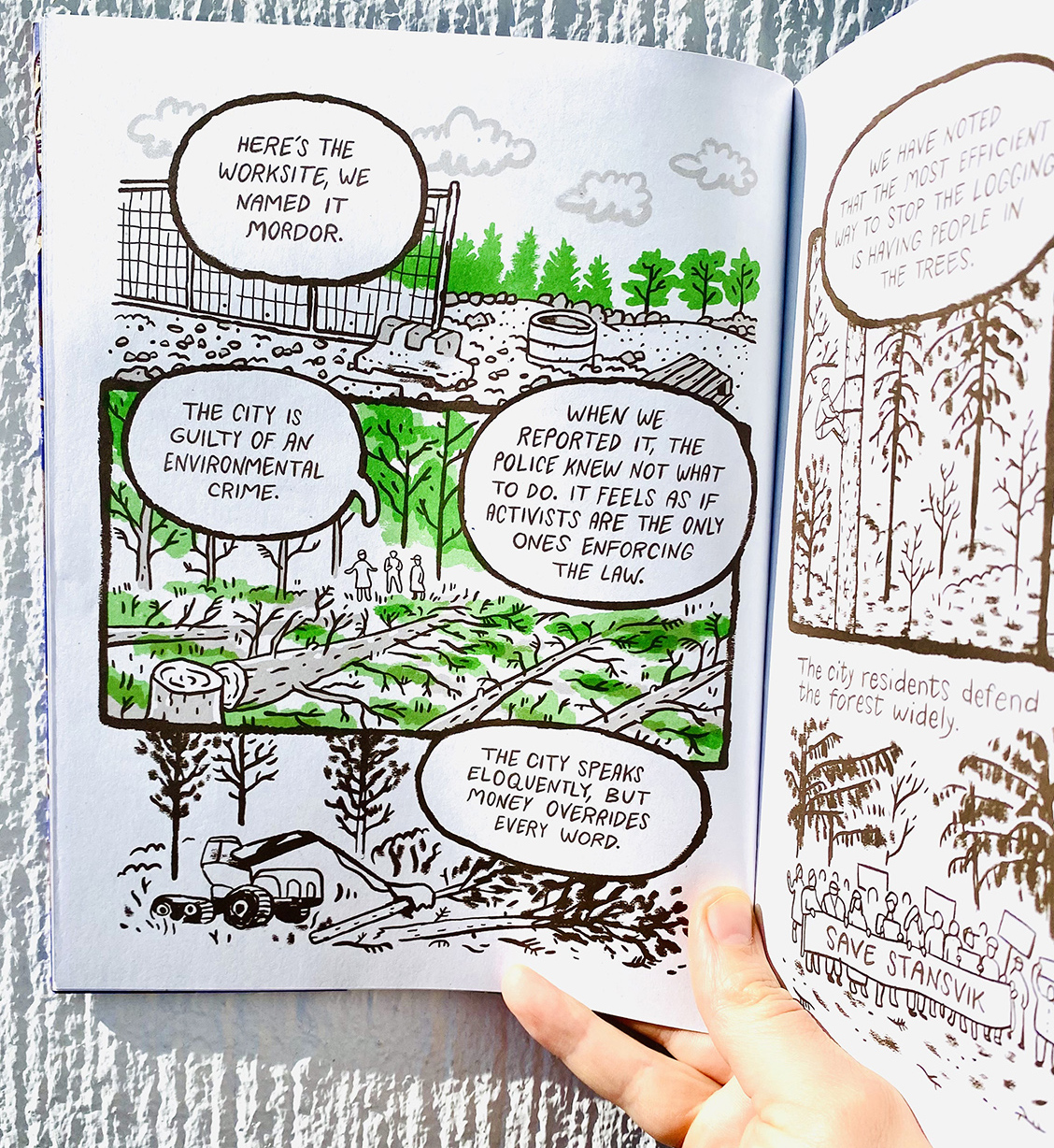 There are some nature themes such as birds and the forest, and I made a little documentary comic about the forest activists in Stansvik, Helsinki. The city is cutting down some rare old forest with endangered species.