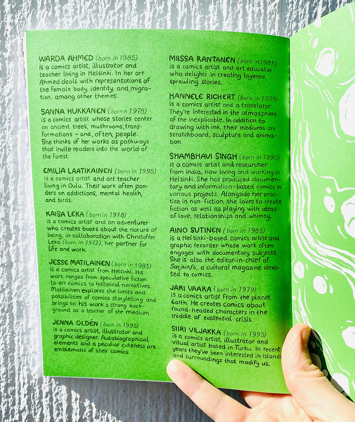 Artists: Warda Ahmed, Sanna Hukkanen, Emilia Laatikainen, Kaisa Leka, Jesse Matilainen, Jenna Oldén, Miissa Rantanen, Hannele Richert, Shambhavi Singh, Aino Sutinen, Jari Vaara, Siiri Viljakka. Editors: Esko Heikkilä, Hannele Richert.